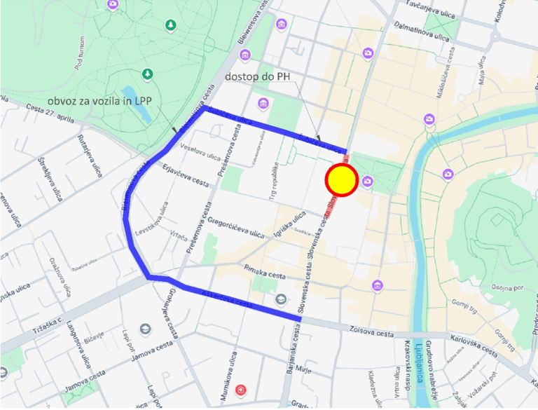 Obvoz za vozila bo možen preko Šubičeve ulice, Bleiweisove ceste in Aškerčeve ceste ter enako v obratni smeri.
