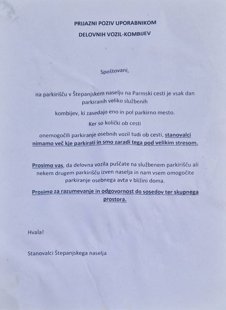 V Štepanjskem naselju je že dlje časa napeto zaradi pomanjkanja parkirnih mest. Situacijo pa so v zadnjih tednih dodatno zaostrili še prebivalci sami – na sceno je stopil samooklicani 'parkirni inšpektor', poleg tega se kršitelje fotografira, objavlja na družbenih omrežjih in jih javno 'linča'.