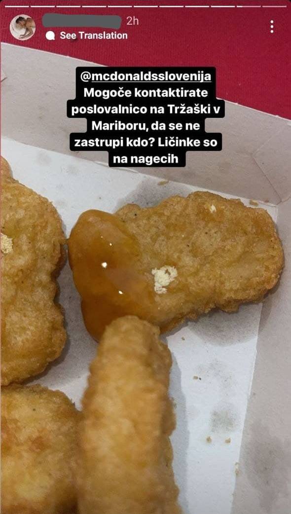 Po družbenih omrežjih je zaokrožil posnetek gostje, ki je v McDonald'su v Mariboru naročila devet piščančjih medaljonov, na njih pa nato, ko je prišla domov, opazila bele ličinke.