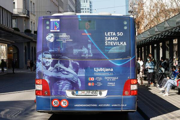Na evropsko prvenstvo v nogometu UEFA do 21 let opozarja tudi mestni avtobus, odet v barve prvenstva, ki vozi po ljubljanskih cestah.
