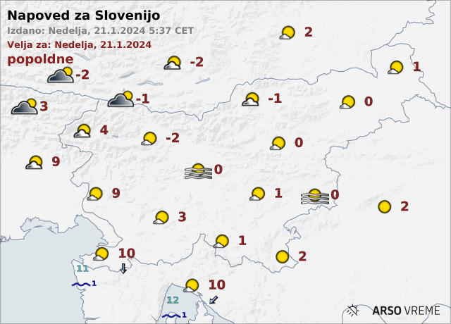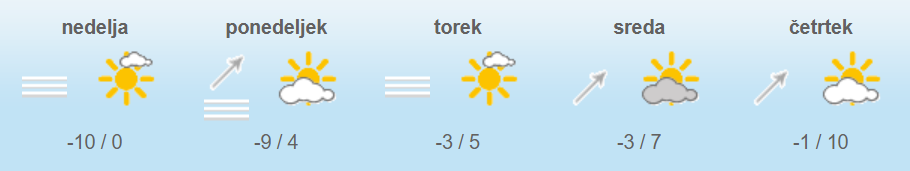 Najvišje dnevne temperature bodo od -2 do 4, na Primorskem do 10 stopinj Celzija.