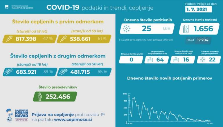 V Sloveniji so včeraj, 1. julija, opravili 1656 PCR testiranj na koronavirus in potrdili 25 novih okužb, gre za 1,5-odstotni delež okužb.