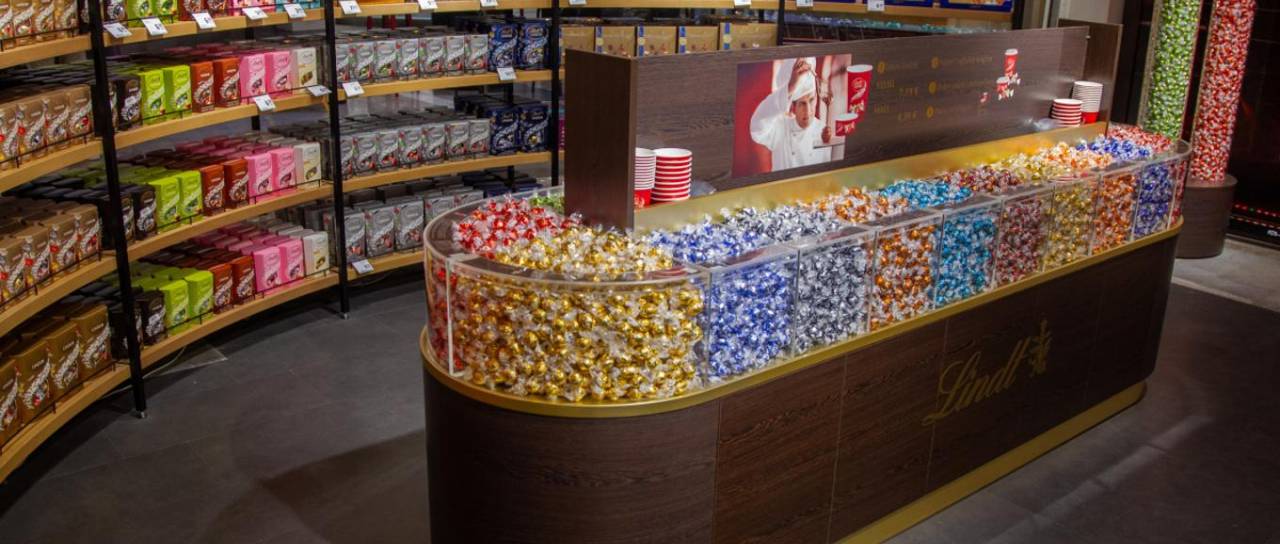 V trgovini lahko opazimo široko paleto luksuznih čokolad Lindt, vključno s čokoladnimi tablicami, pralinami in bonbonierami.