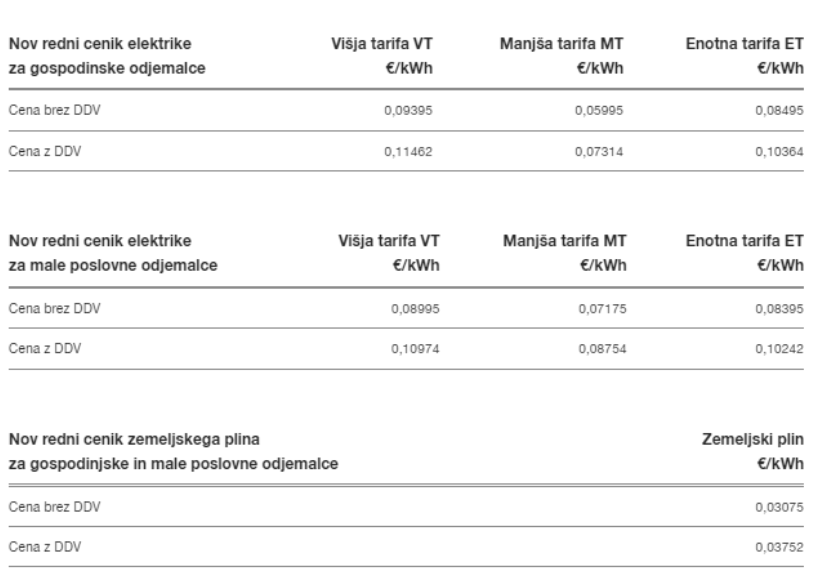 Nove cene elektrike in zemeljskega plina so razvidne iz tabele spodaj.