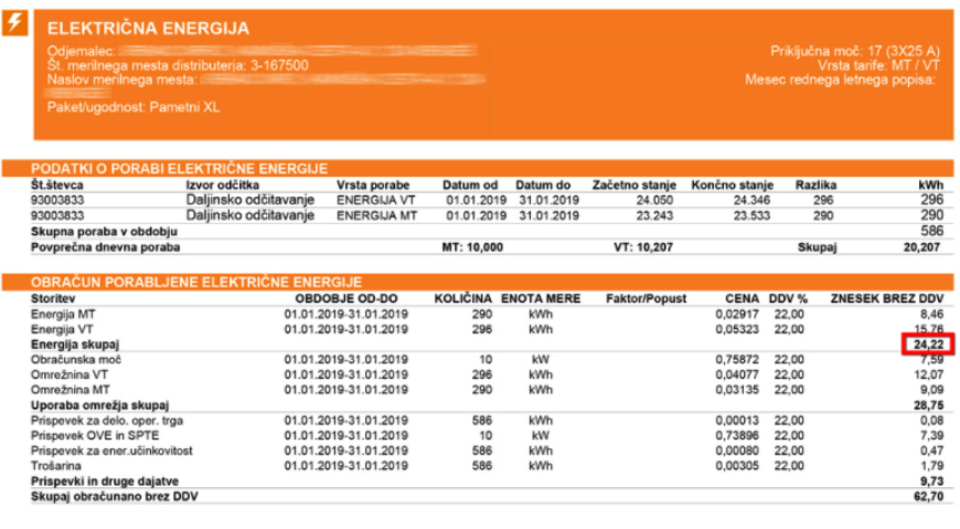 Redna cena elektrike za gospodinjstva bo z decembrom višja za nekaj manj kot 30 odstotkov. To pa ne pomeni, da bo za toliko višji tudi znesek, ki ga plačujete vsak mesec. Nasprotno: končni račun se bo povišal bistveno manj, saj se draži samo ena postavka na vaši položnici, tista, označena na sliki.