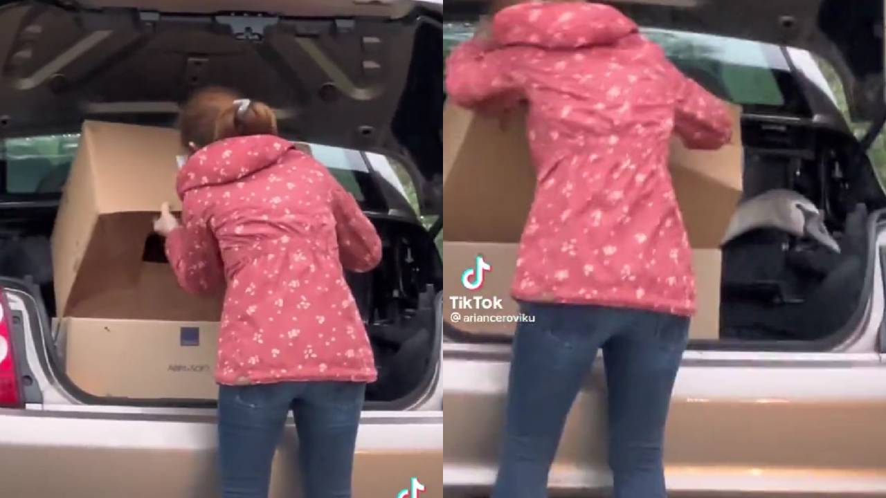 Video prikazuje žensko, ki v deževnem vremenu v prtljažnik daje veliko kartonasto škatlo. V škatli pa je labod.