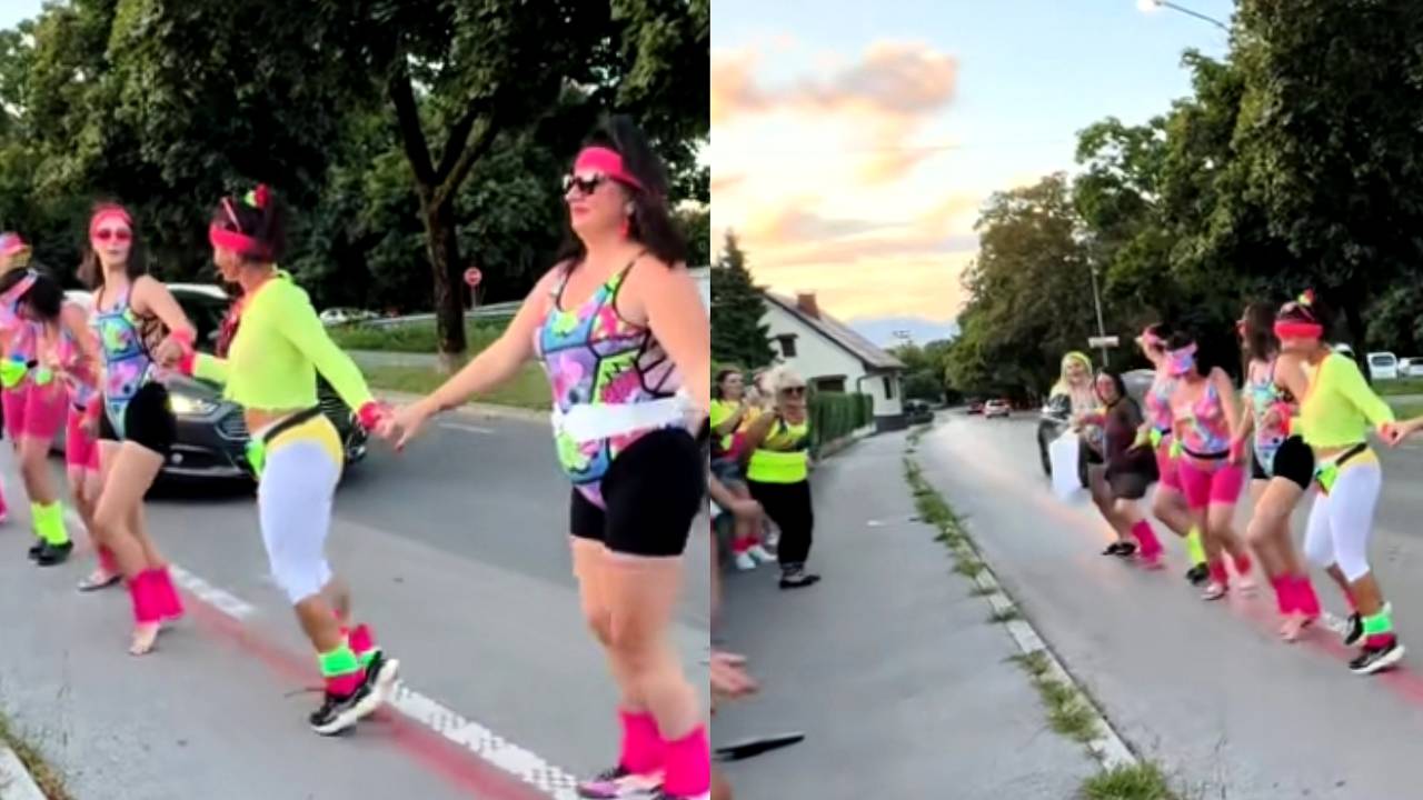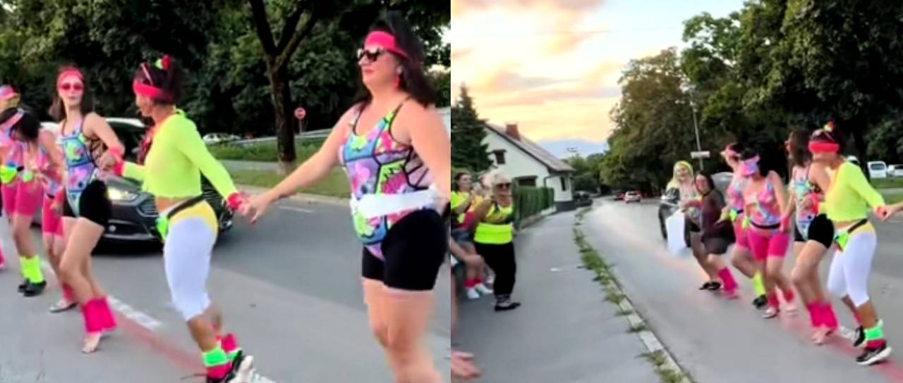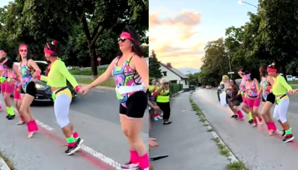Ženske so zaplesale v barvitih telovadnih opravah, ki so spominjale na videz iz devetdesetih let.