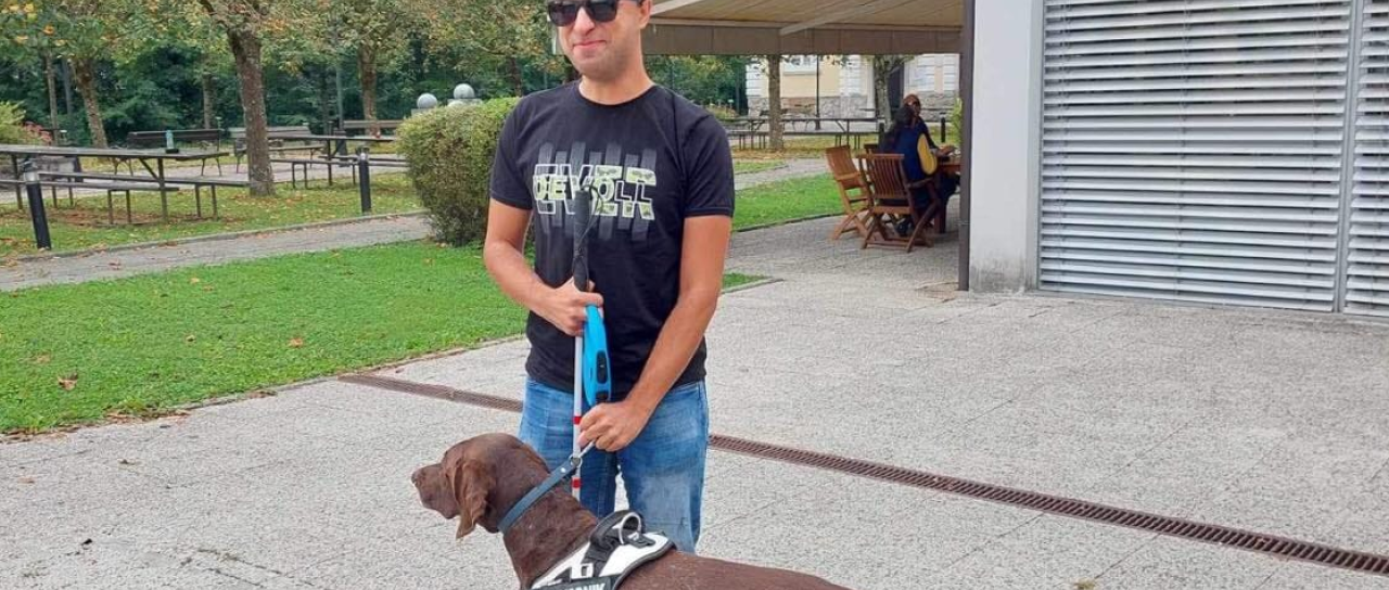 Miha je slep in pes vodnik mu pomaga pri vsakodnevnem gibanju in orientaciji v prostoru.