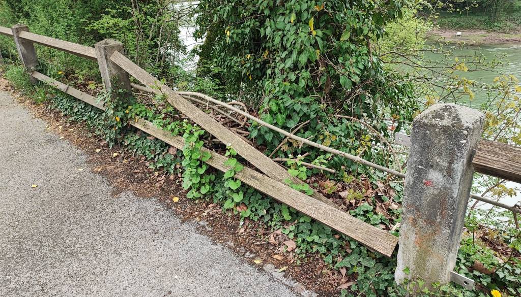 Ob cesti je pločnik, ki poteka tik nad reko Ljubljanico, zaščiten pa naj bi bil z ograjo. A ta je poškodovana in zrušena – pešci so tako popolnoma brez zaščite pred padcem.