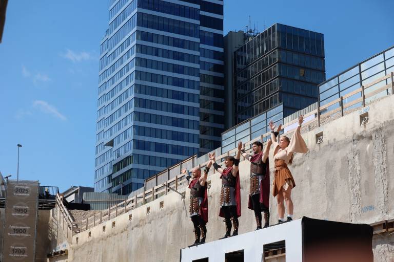 Za uvod v slovesnost so nastopili akrobati, oblečeni kot rimski vojaki, ki so skakali na napihnjeno podlago v gradbeno jamo.