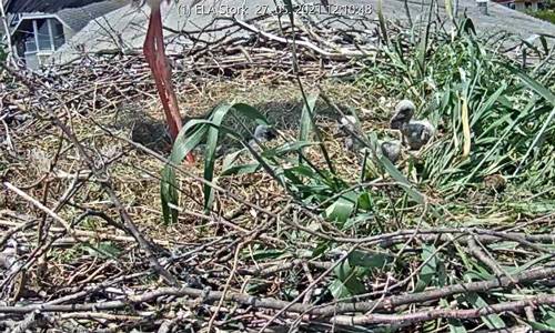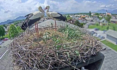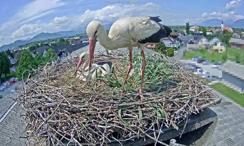 Na dimniku je postavljena kamera, ki snema mlado družino. Štorklje lahko v živo spremljate na njihovem Youtube kanalu.