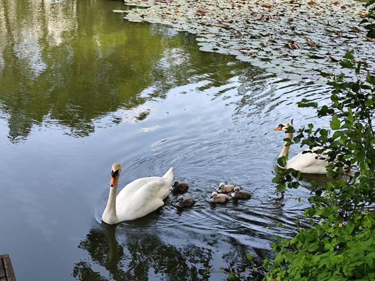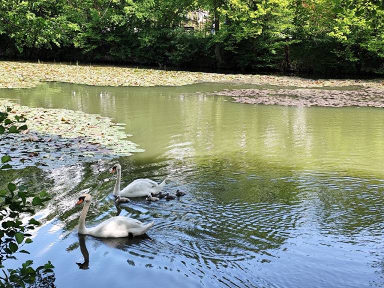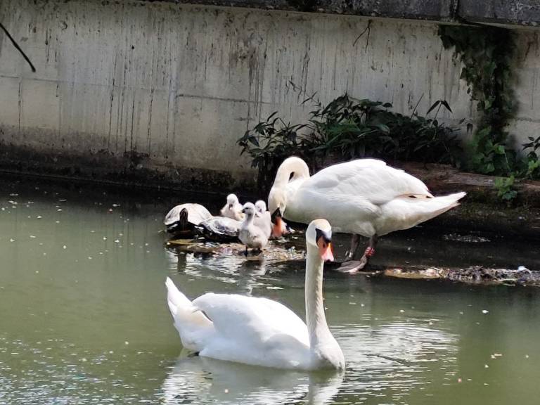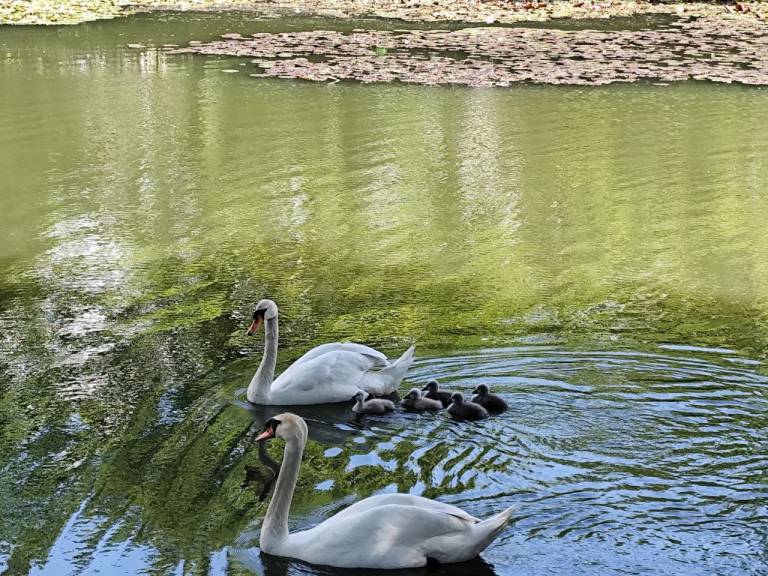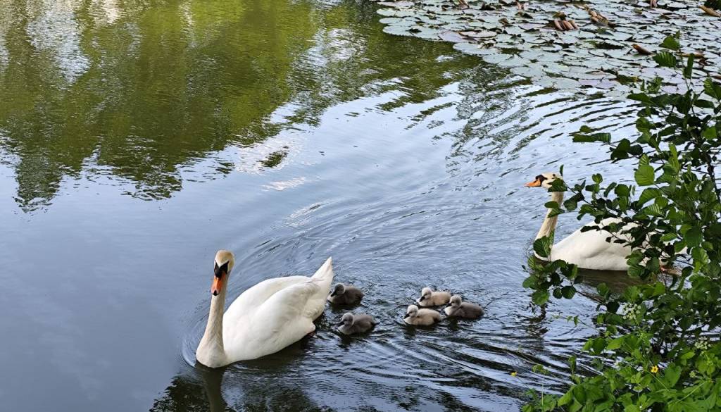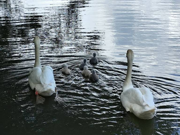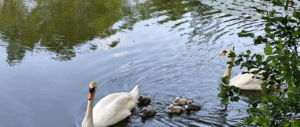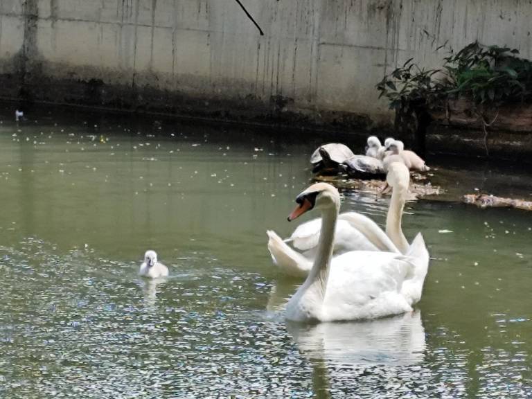 Ti so vsak dan opazno večji, zdaj že plavajo s staršema po Tivolskem ribniku. Najprej se je opogumil en labodek, kmalu pa so mu v vodo sledili še ostali in v vrsti so zaplavali.