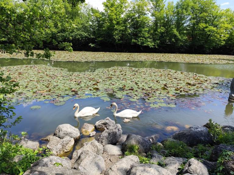 Tivolski ribnik je že več let dom za labodji par. Tudi letos sta zgradila gnezdo na podestu blizu iztoka iz ribnika.