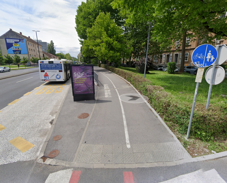 Kolesar in peška sta trčila na območju, kjer kolesarsko stezo in pločnik ločuje oglasni pano. Ali je prav ta postavitev razlog za nesrečo?
