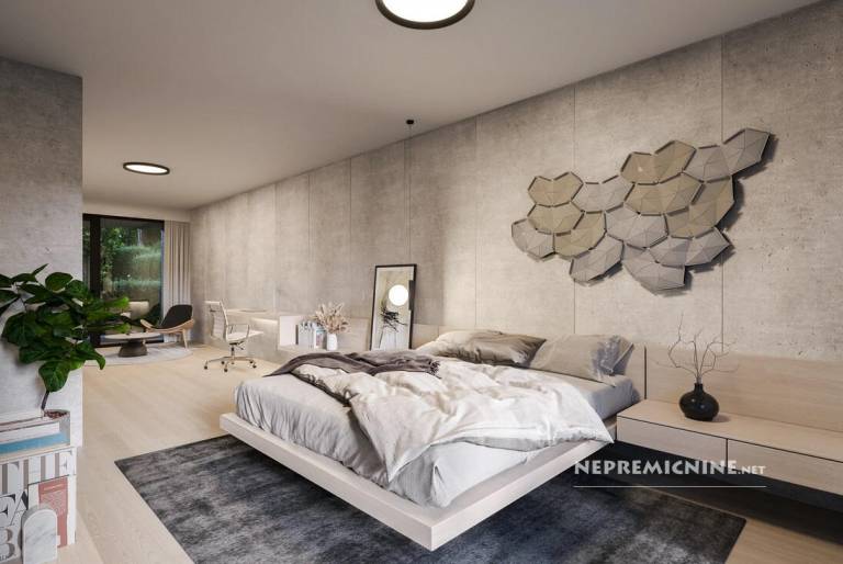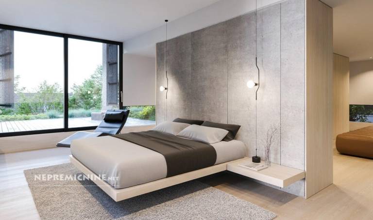 Terasni del se ponaša s spalnico z banjo ter izhodom na teraso, garderoba in kopalnica.