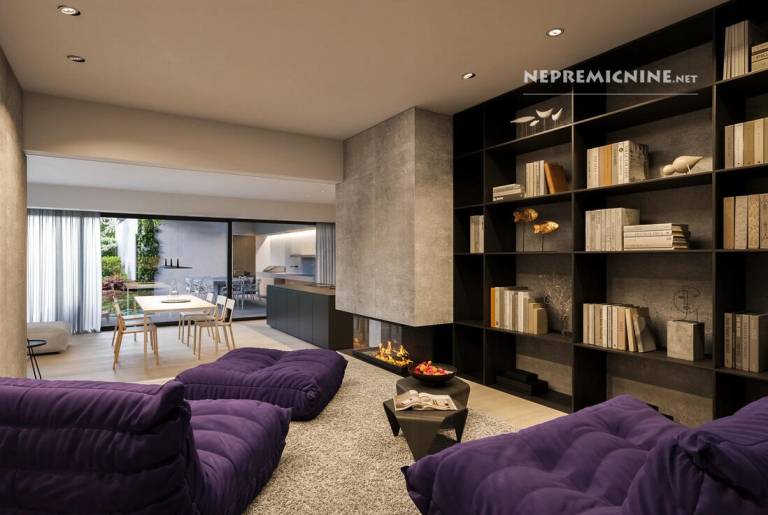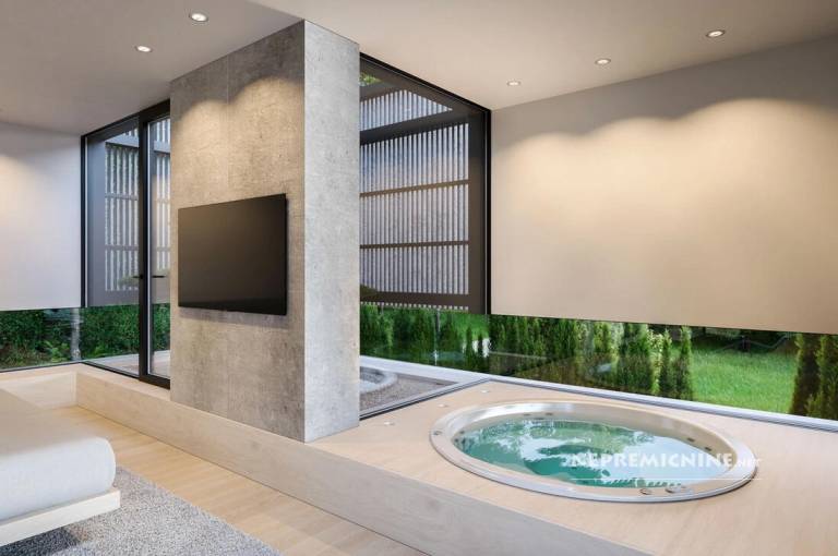 V pritličju so predprostor, dnevna soba s kuhinjo, WC, savna, dnevni del s kaminom, tehnični prostori in shramba. V prvem nadstropju so tri spalnice z izhodom na teraso, tri kopalnice in prav toliko lož.