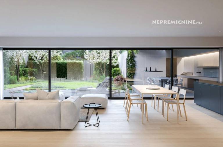 Vilo obdajajo trije nivoji vrtov; ima štiri spalnice, pet kopalnic ter garažo za dva avtomobila z električno polnilnico.