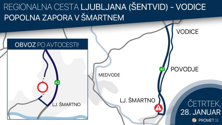Regionalna cesta, ki pelje iz Ljubljane proti Vodicam, bo predvidoma od jutri, 28. januarja, od 9. ure pa vse do 13. julija zaprta zaradi gradnje kanalizacije. Obvoz bo urejen za vsa vozila, in sicer po gorenjski avtocesti med priključkoma Šmartno in Vodice v obe smeri.