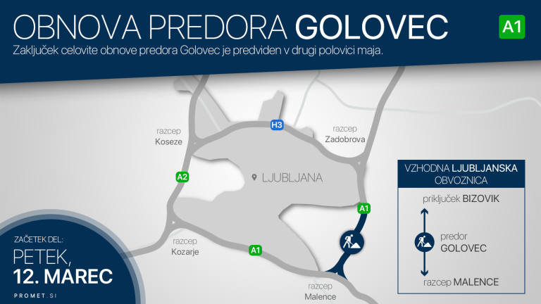 Od danes, 15. marca, pa do predvidoma druge polovice maja (do približno 17.) bo na vzhodni ljubljanski obvoznici vzpostavljena popolna zapora vzhodne cevi predora Golovec iz smeri razcepa Malence proti Bizoviku, promet bo preusmerjen.