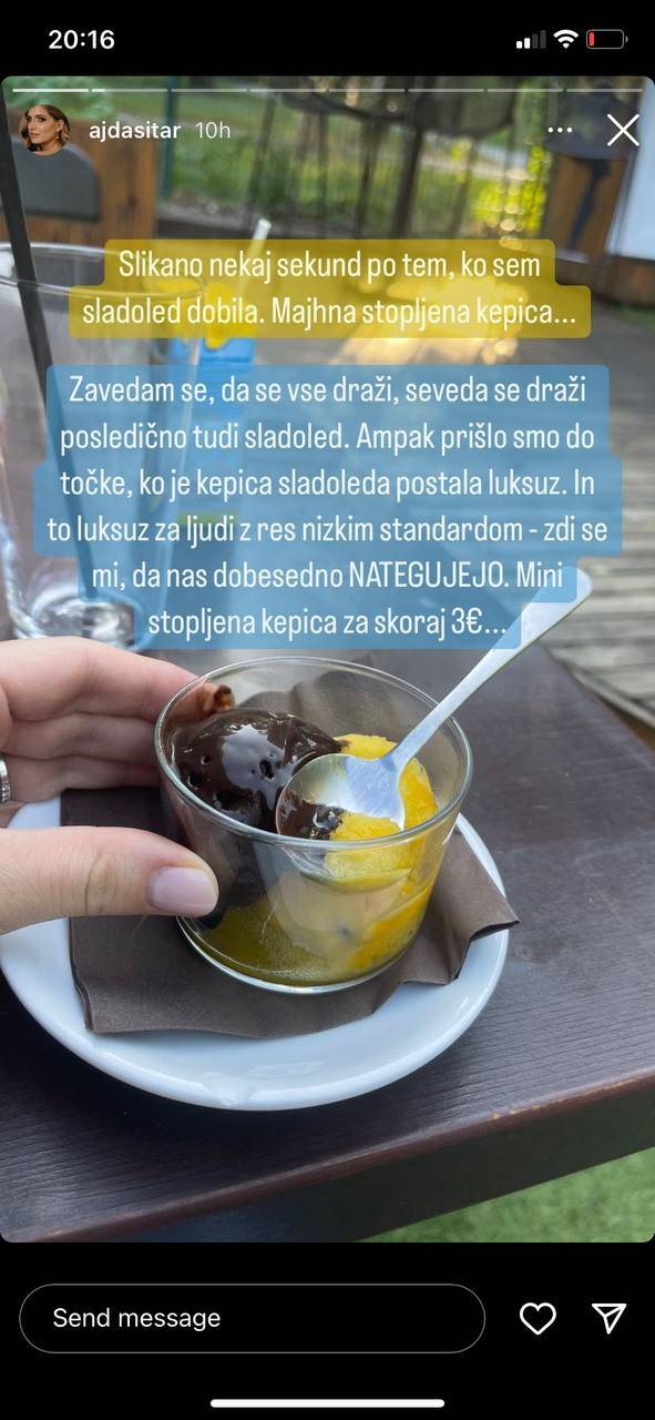 Ajda Sitar je na svojem Instagram profilu delila fotografijo majhne stopljene kepice sladoleda, za katero je odštela slabe tri evre.