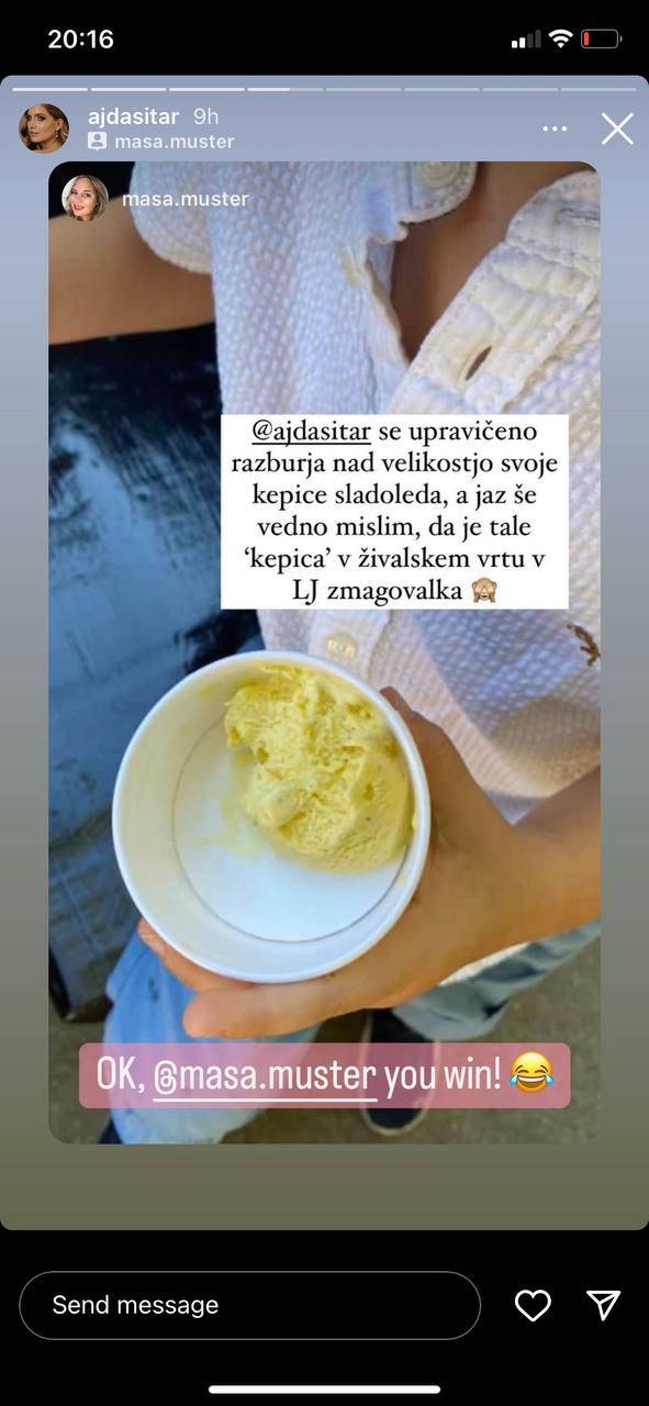 Svojo izkušnjo pregrešno dragega sladoleda in skope kepice, je na Instagramu delila tudi Maša Muster. Objavila je fotografijo napol praznega sladolednega lončka in zapisala, da je to kepica, ki jo je dobila v ljubljanskem živalskem vrtu.