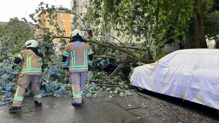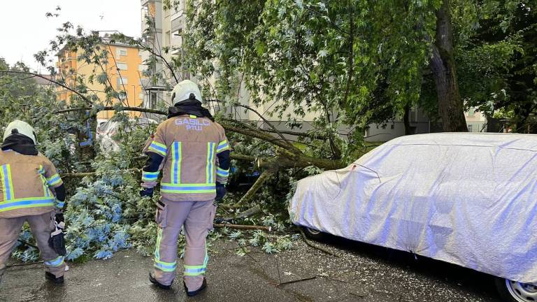 Gasilci imajo polne roke dela tudi na Ptuju, na Kvedrovi ulici pred stanovanjskim blokom se je podrlo večje drevo, ki ga že odstranjujejo gasilci Prostovoljnega gasilskega društva Ptuj.