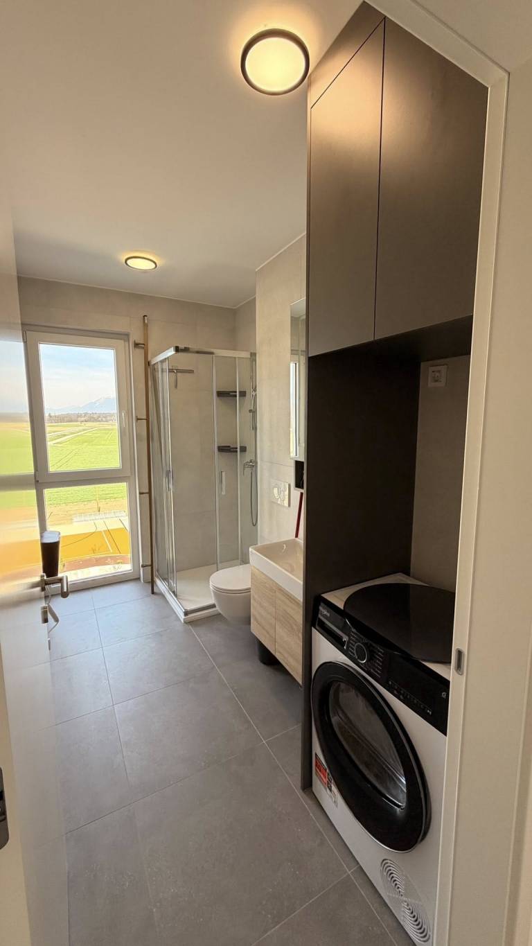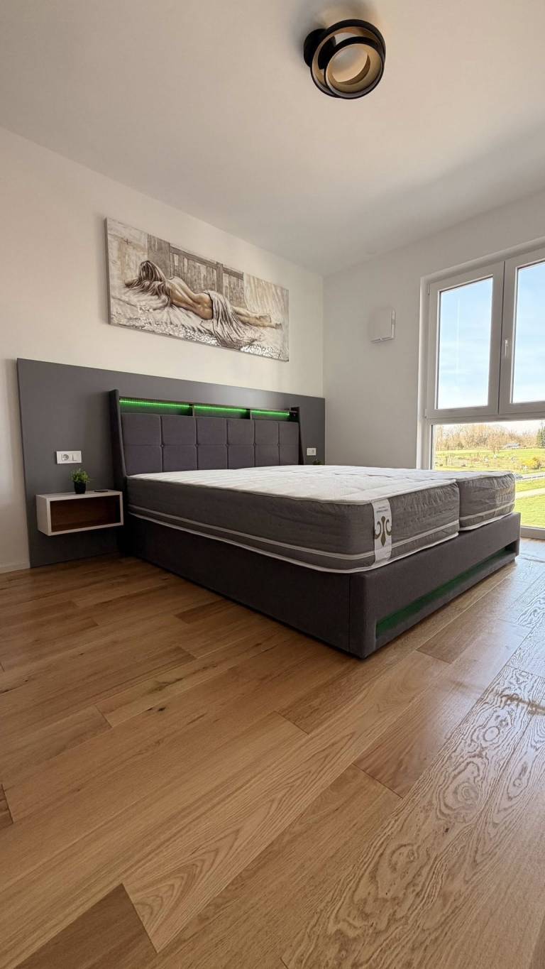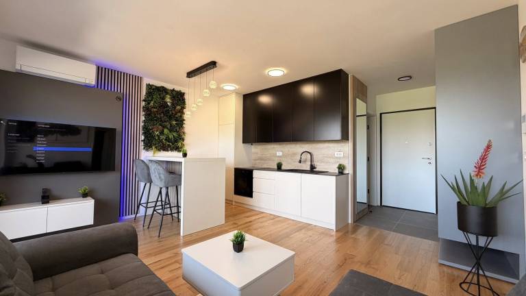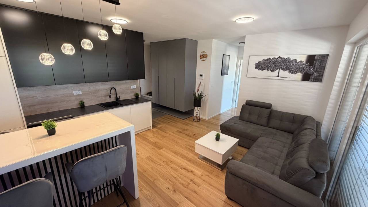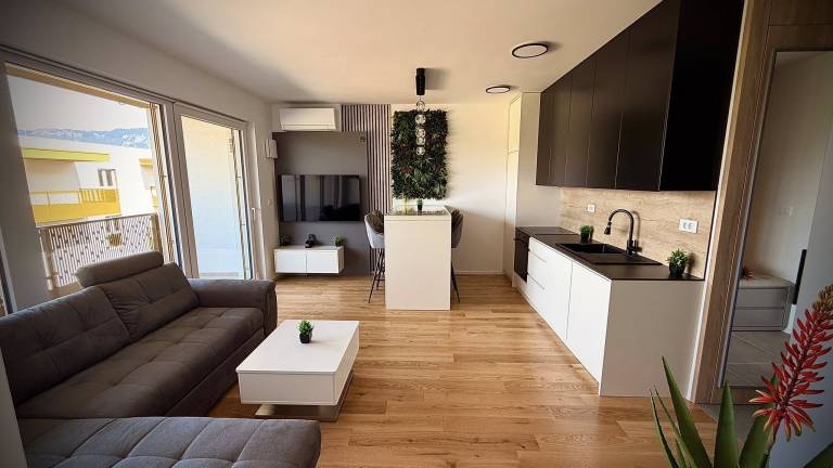 Kupca čaka kuhinja po meri z mehanizmi Blum in LED osvetlitvijo, vsi gospodinjski aparati, spalnica s posteljo dimenzije 180 krat 200, dnevna soba s sedežno garnituro in televizijsko steno, jedilnica, kopalniški elementi, utility ter tudi dekoracija, ogledala, svetila in slike.