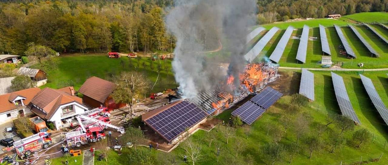 Zagorel gospodarski objekt s sončno elektrarno, uskladiščeni kmetijski stroji in osebno vozilo popolnoma uničeni