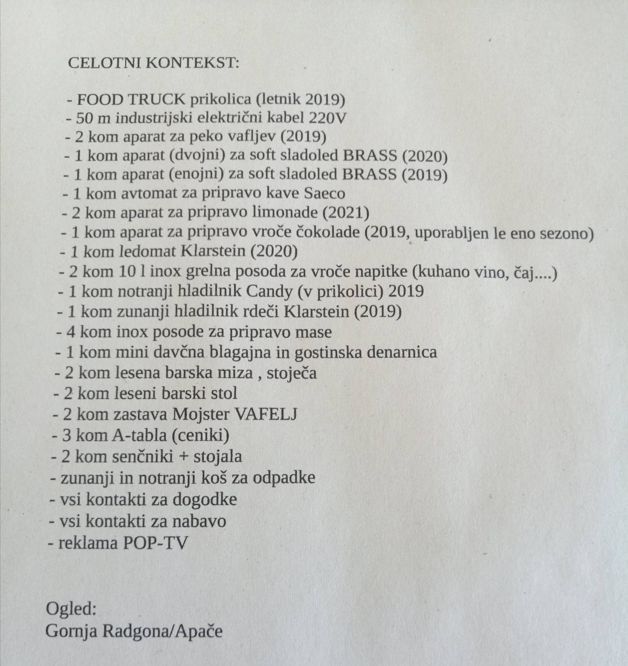 Poslovni model je odličen in z veseljem bi ga s parterjem peljala še naprej, a žal je bolezen tista, zaradi katere tega posla več ne moreva opravljati in sva ga primorana prodati. V prilogi je našteto vse, kar je vključeno v ceno. Vljudno vas prosimo, da kličete samo resni kupci, ki prepoznate vrednost naložbe.«