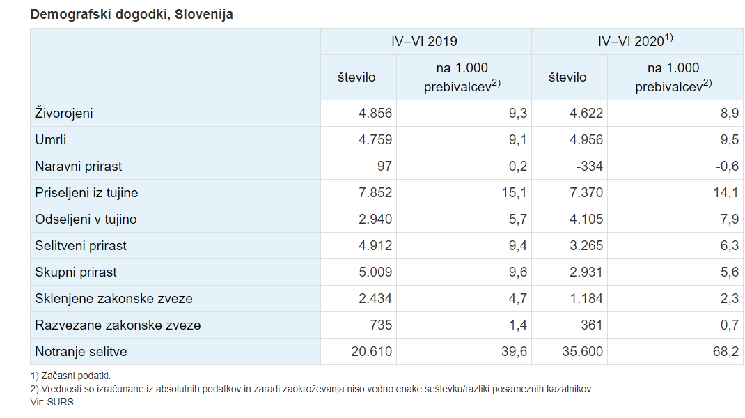 V drugem četrtletju 2020 se je rodilo 4.622, umrlo pa je 4.956 prebivalcev. Število rojenih je bilo za 234 (4,8 %) nižje, število umrlih pa za 197 (4,1 %) višje kot v istem obdobju leta 2019, so sporočili iz Statističnega urada RS.