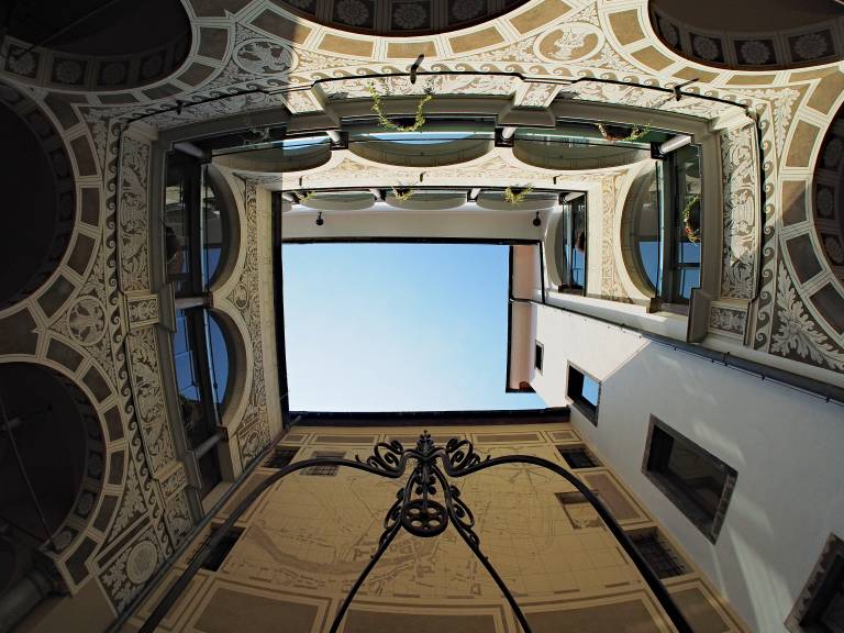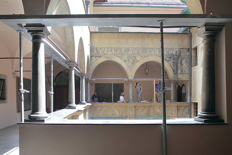 V notranjosti je z grafitno dekoracijo okrašeno baročno arkadno dvorišče (Osrednji atrij), v vogalu katerega stoji baročni Narcisov vodnjak (kipar Francesco Robba), prinesen z gradu Bokalce.