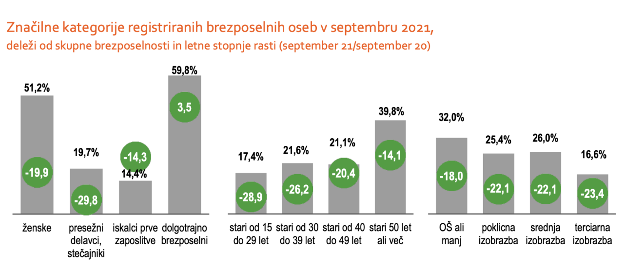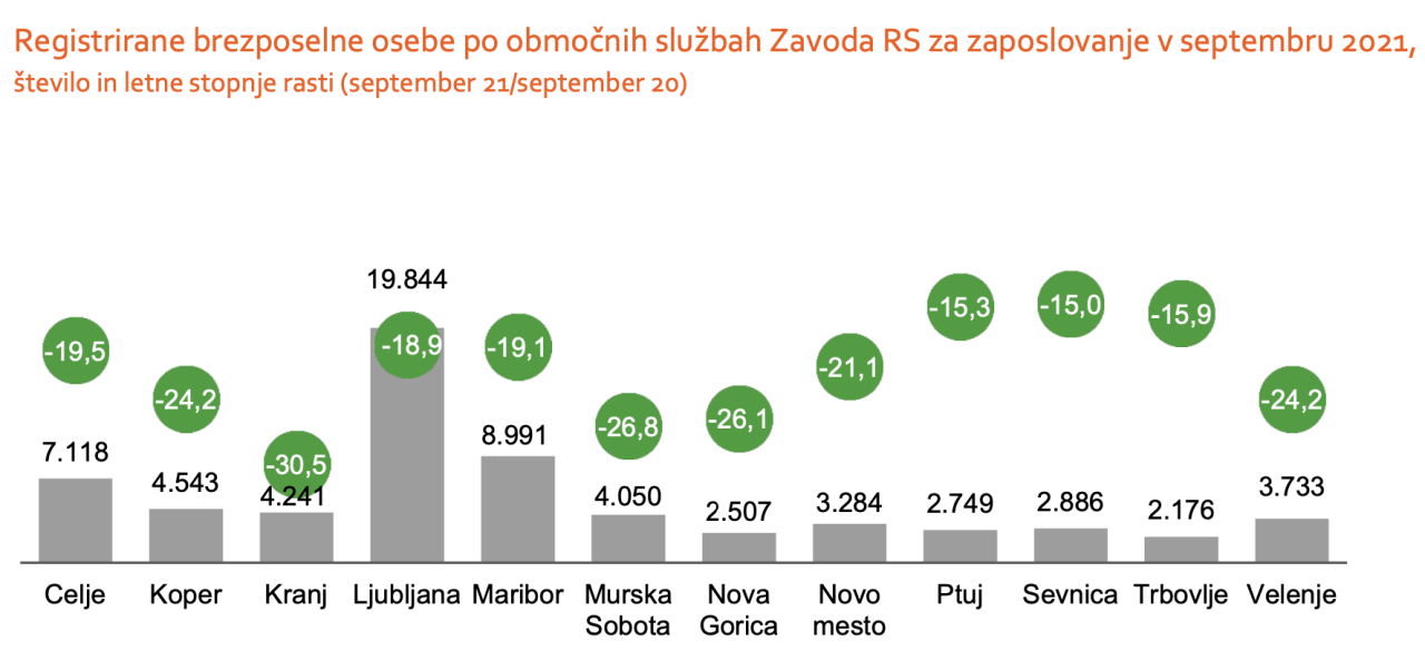 Ob koncu septembra je bilo registriranih 66.122 brezposelnih oseb, kar je 3.170 oseb ali 4,6 odstotka manj kot avgusta, v primerjavi s septembrom 2020 pa je bila brezposelnost manjša za 17.644 oseb ali za 21,1 odstotka. V prvih devetih mesecih letošnjega leta je bilo na zavodu v povprečju prijavljenih 77.087 brezposelnih oseb, kar je 9,3 odstotka manj kot v enakem obdobju lani.
