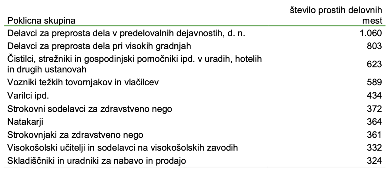 Med tistimi, ki so se zaposlili, je bilo največ tajnikov, prodajalcev, delavcev za preprosta dela v predelovalnih dejavnostih, vzgojiteljev in pomočnikov vzgojiteljev predšolskih otrok, predmetnih učiteljev v osnovni šoli, čistilcev, strežnikov in gospodinjskih pomočnikov in podobno.
