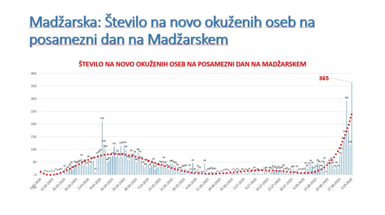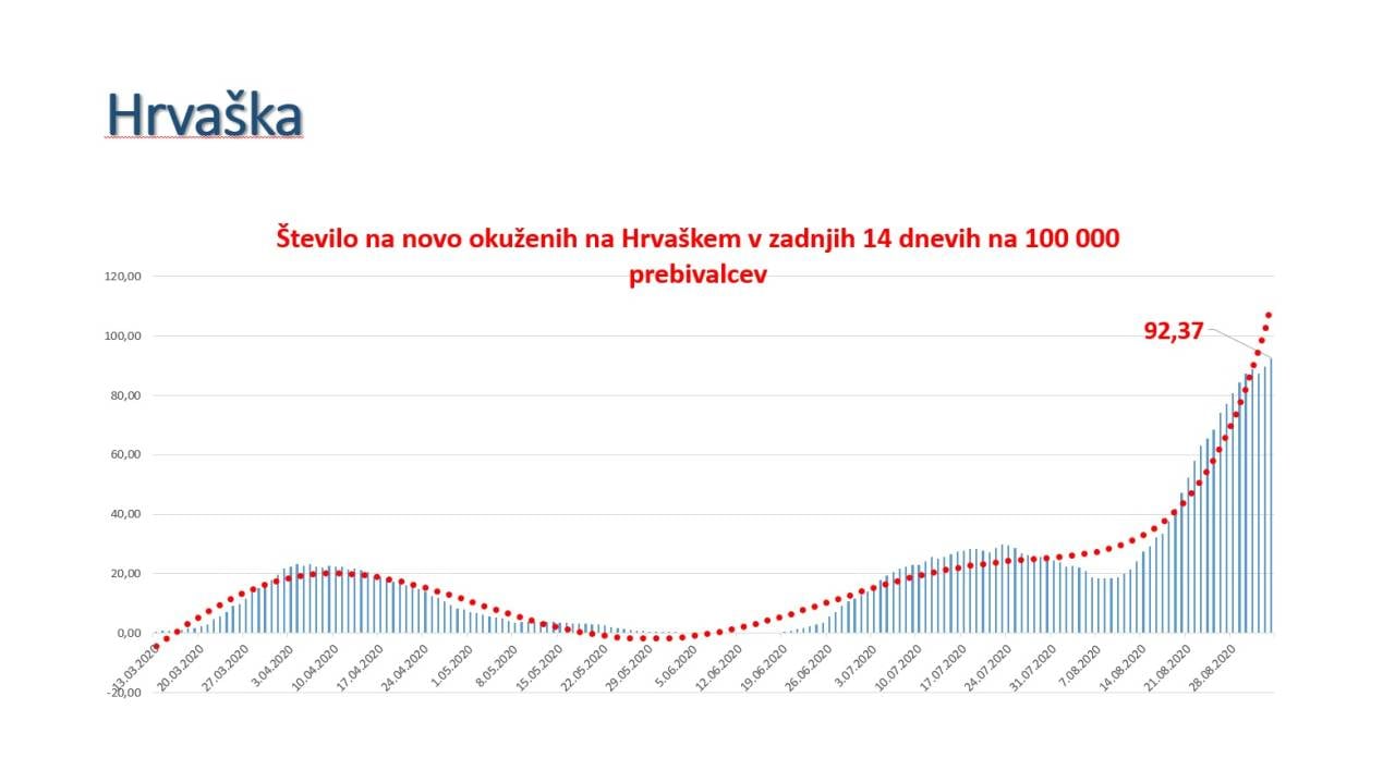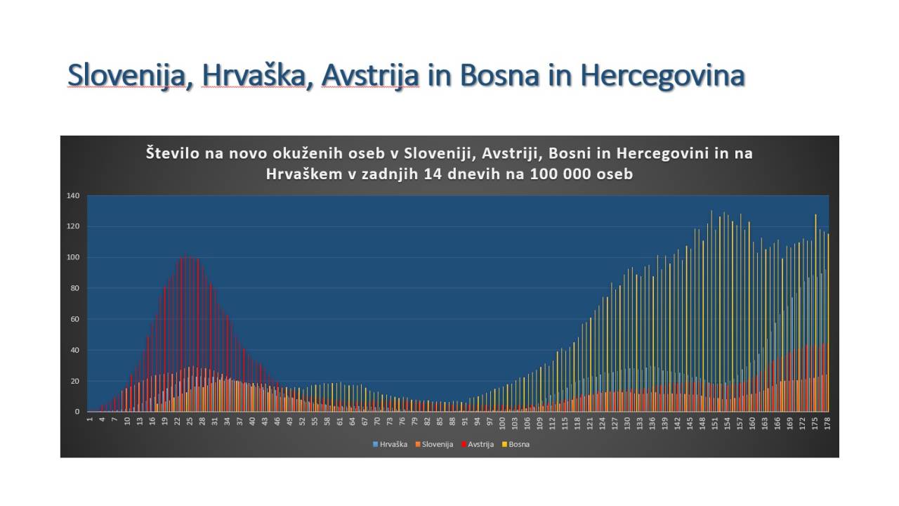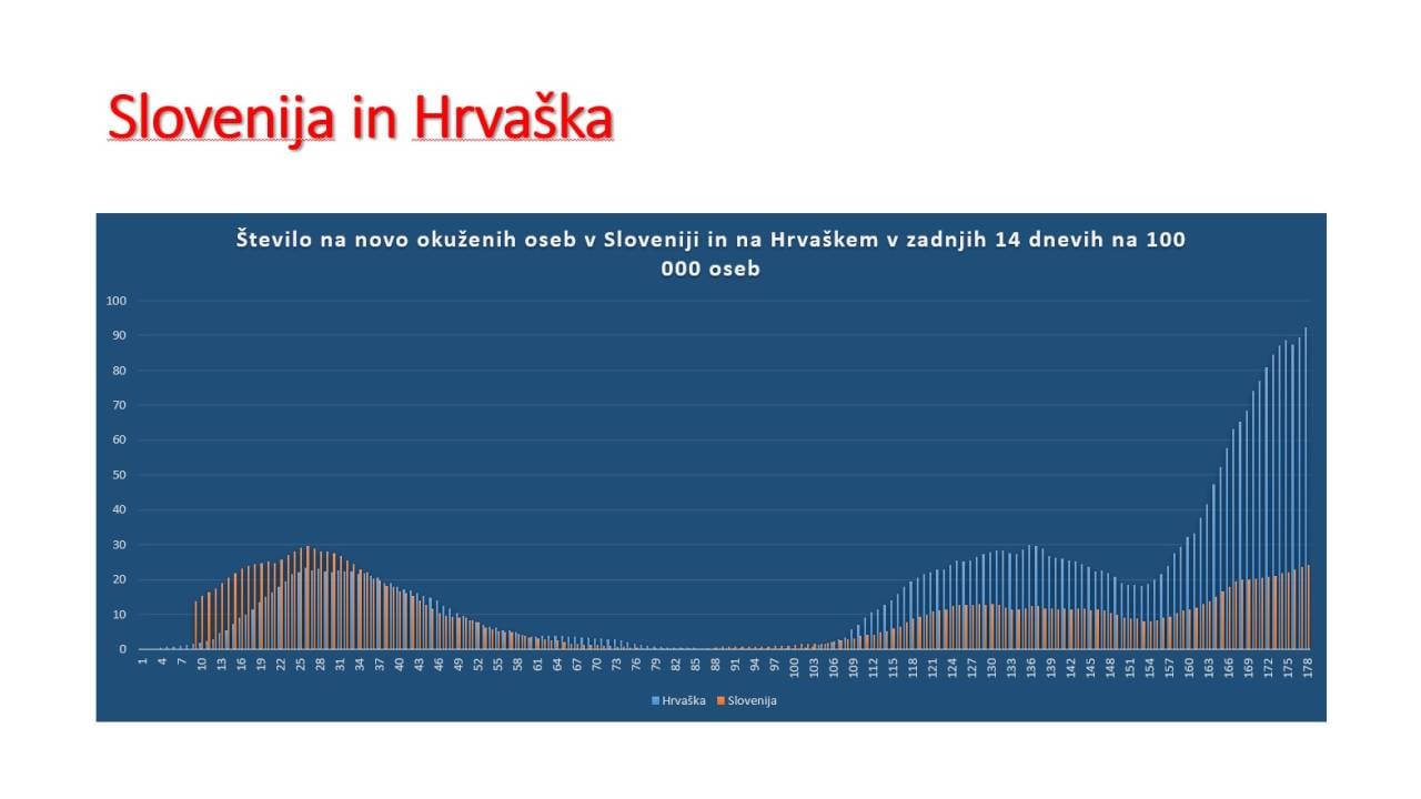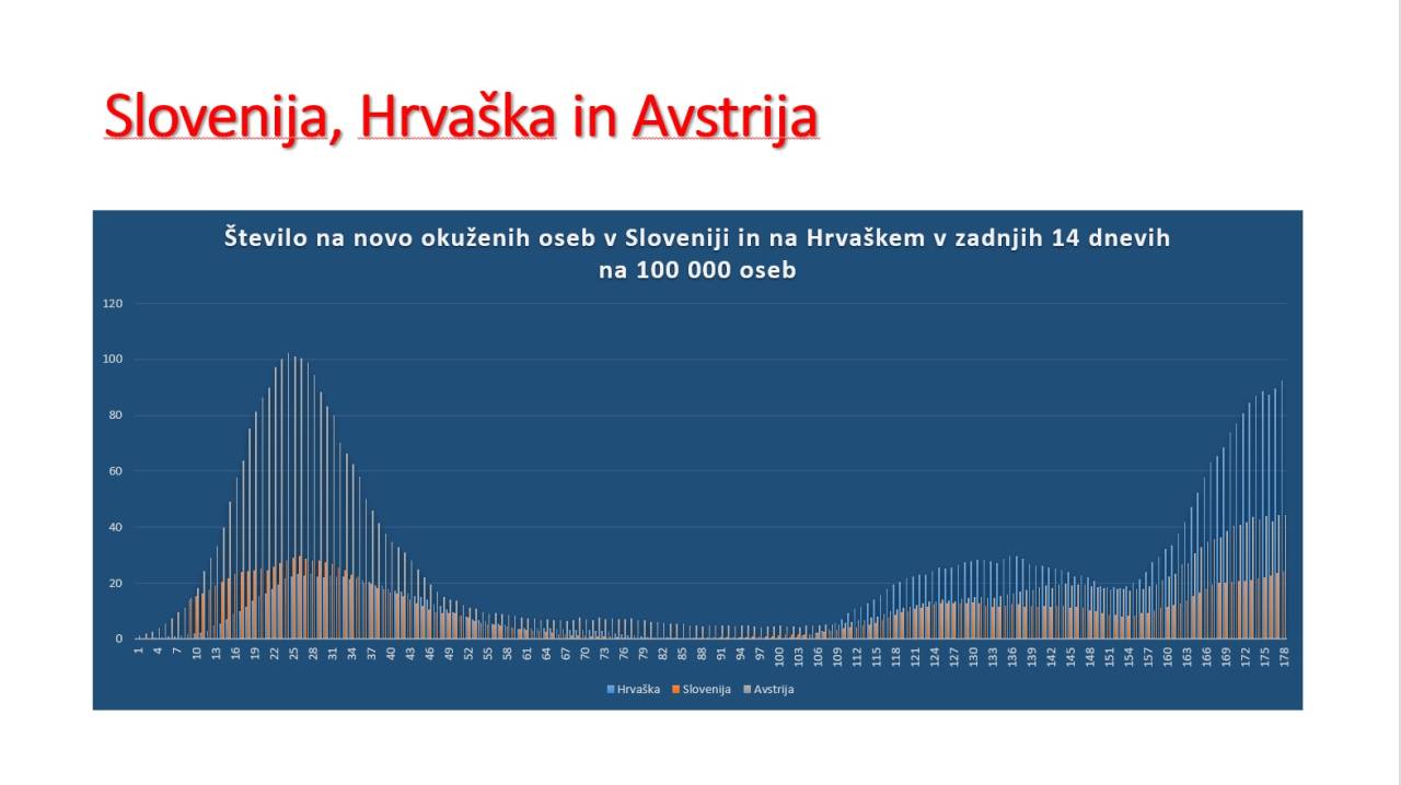 V nadaljevanju je predstavil številne grafe, ki prikazujejo epidemiološko sliko pri nas in v sosednjih državah. Stanje se tako slabša praktično v vseh državah naše soseščine, še najslabše pa je na Hrvaškem. Predstavil je tudi število vnosov iz posamezne države in obrazložil, da igra to pomembno vlogo pri spreminjanju seznamov varnih držav. Pri tem je poudaril, da so več kot trije vnosi že razlog za analizo in pri tem napovedal, da bo prihodnji teden govora tudi o Avstriji. V ponedeljek sicer prihaja na obisk v Ljubljano avstrijski kancler Sebastian Kurz, ki se bo sestal s slovenskim premierjem Janezom Janšo.