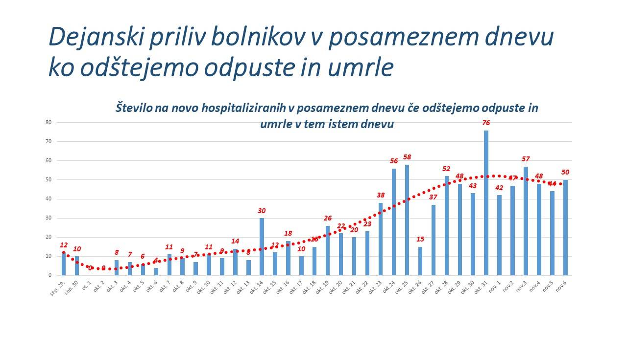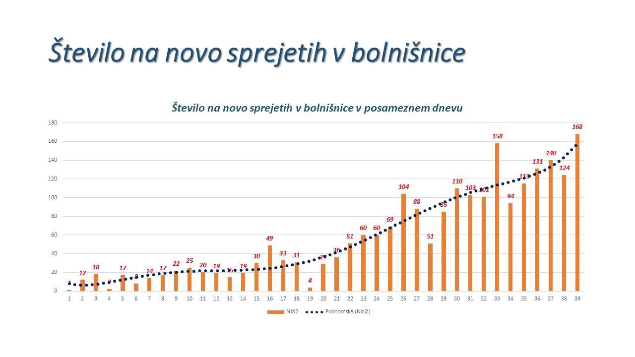 Bolnišnično oskrbo je potrebovalo 1069 bolnikov. Iz bolnišnic je bilo odpuščenih 92 bolnikov. V primerjavi s sredo se je včeraj ponovno povečalo število oseb, ki so potrebovale intenzivno nego, 168. Umrlo je 26 oseb.