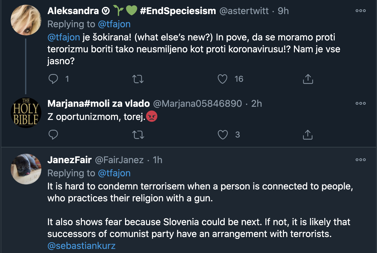 "Šokirala in žalostna sem zaradi tega strašljivega napada! Še naprej se moramo boriti proti terorizmu tako neusmiljeno, kot se borimo proti koronavirusu. Za svet, kjer lahko ljudje izvajajo svoje religije, ne da bi bili v skrbeh, da jih bodo ustrelili."