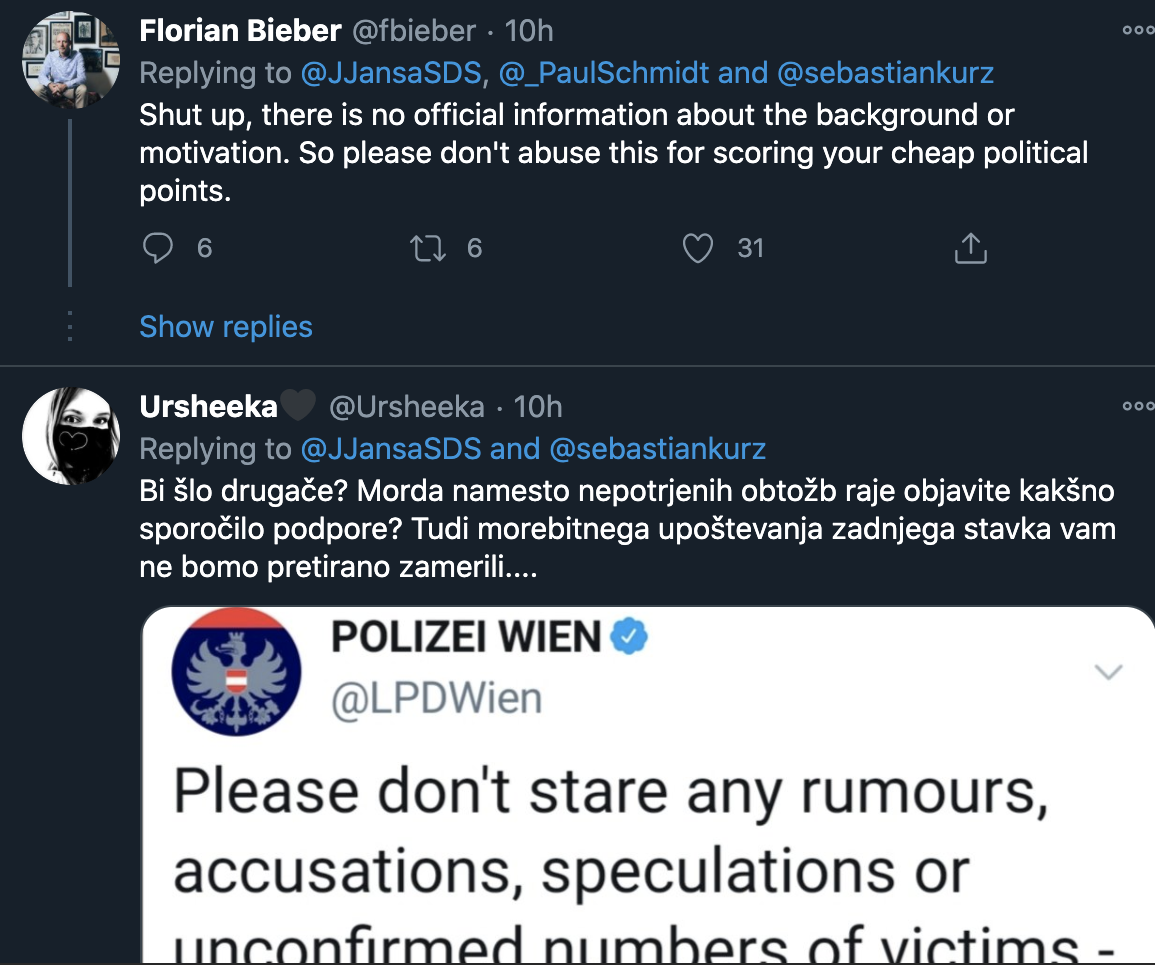 Z Avstrijo žaluje ves svet, hitro po napadu so se pojavili odzivi na družbenih omrežjih, poleg izražanja sožalja in sočutja pa so nekateri že iskali krivce in politične motive.