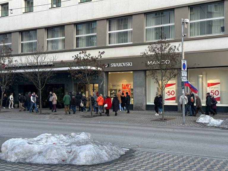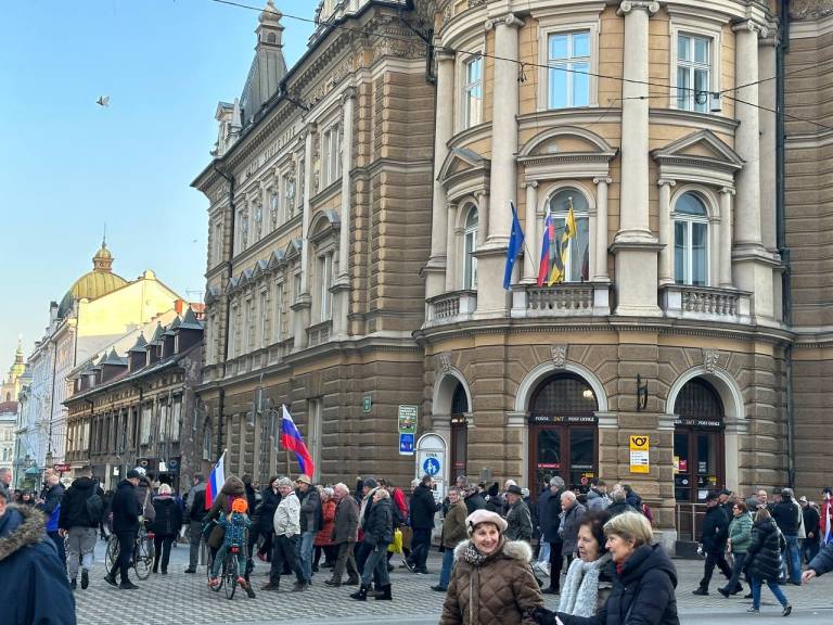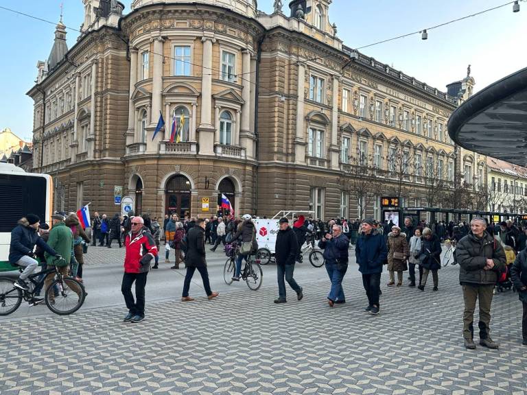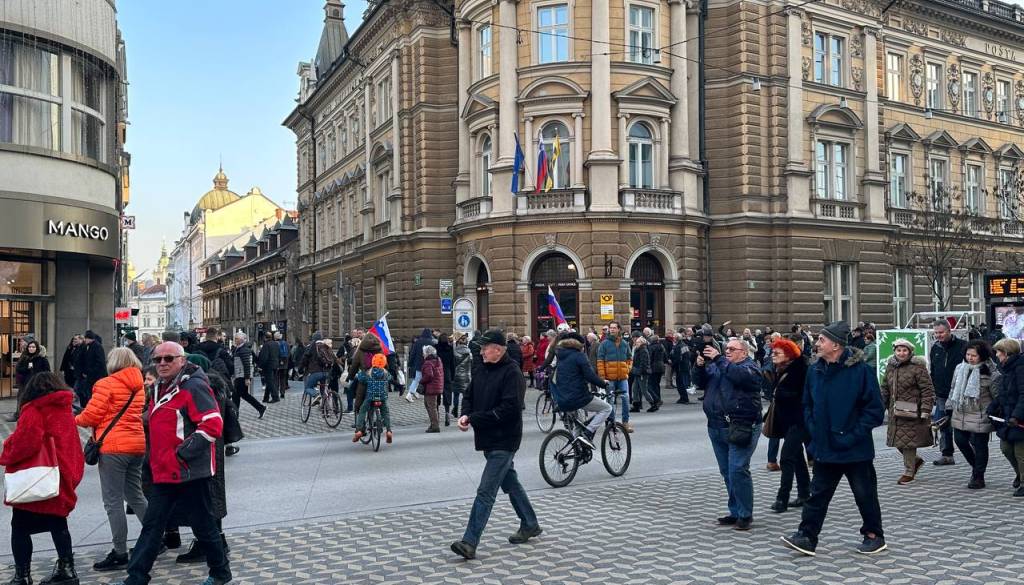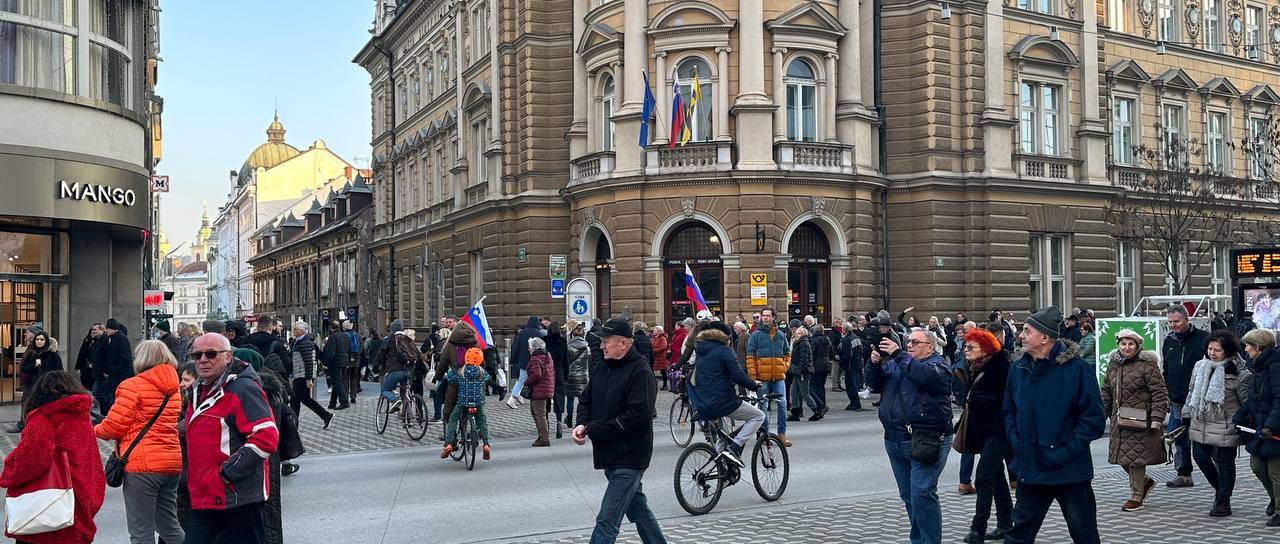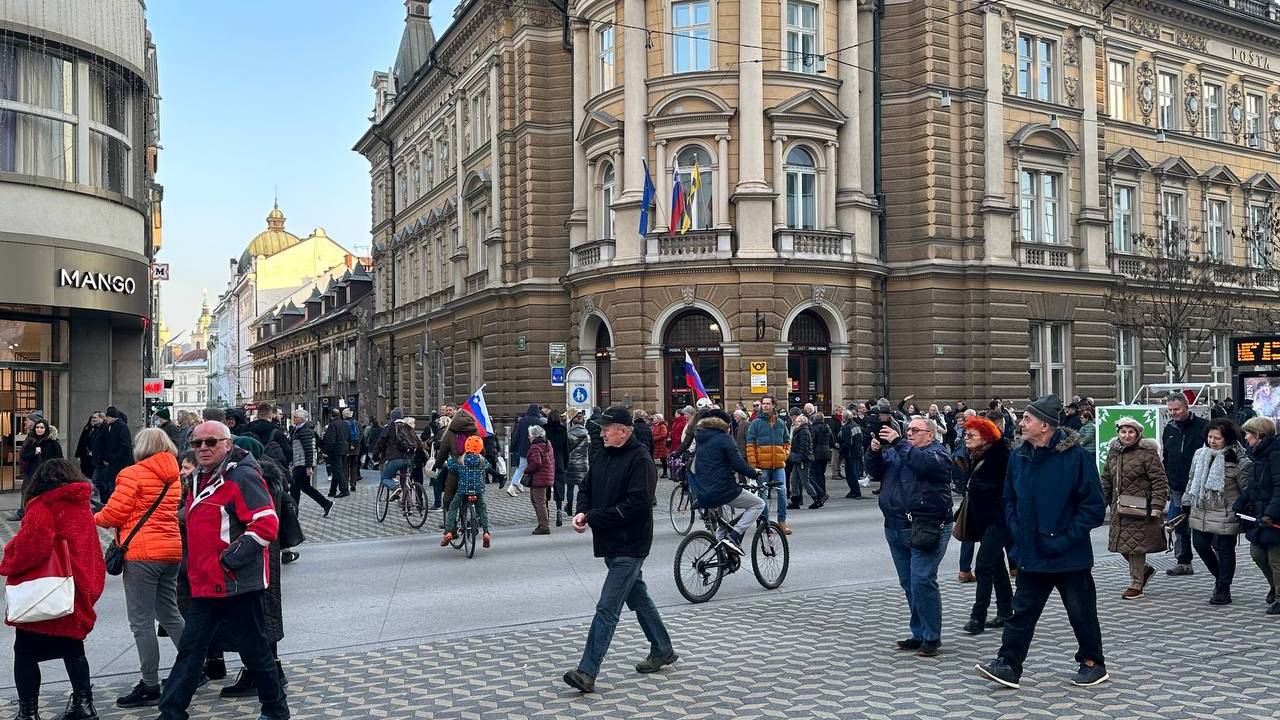 V večtisočglavi množici na shodu v središču Ljubljane so predvsem starejši prebivalci, številni pa v rokah nosijo slovenske zastave.