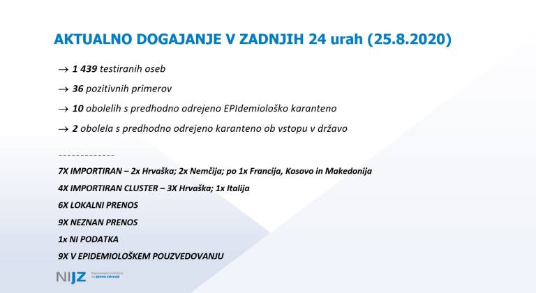 Obenem je Kacin poudaril še, da je tretjina današnjih okužb potrjena pri posameznikih, ki jim je bila še pred tem odrejena karantena, kar dokazuje, da je uvedba karantene za vse, ki se vračajo iz epidemiološko nevarnih držav, učinkovita rešitev vlade.
