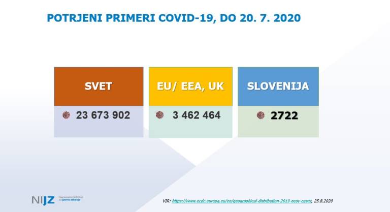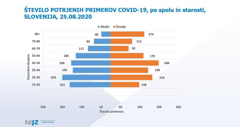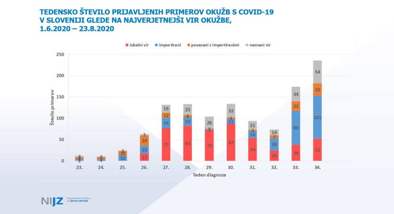 Nuška Čakš Jager z Nacionalnega inštituta za javno zdravje je predstavila trenutno epidemiološko sliko po svetu in pri nas. Ob tem je pohvalila, da imamo v Slovenijo visoko število opravljenih testov, kar nas uvršča na vrh evropskih držav, 14-dnevna kumulativna incidenca pa kaže, da imamo 20,14 okuženih na 100.000 prebivalcev. Med zdravstvenimi delavci okužbe ne naraščajo, je pa bila včeraj nova okužba potrjena pri varovanki doma starejših občanov. Trend okužb v zadnjem času je sicer nagnjen k mlajšim starostnim skupinam.