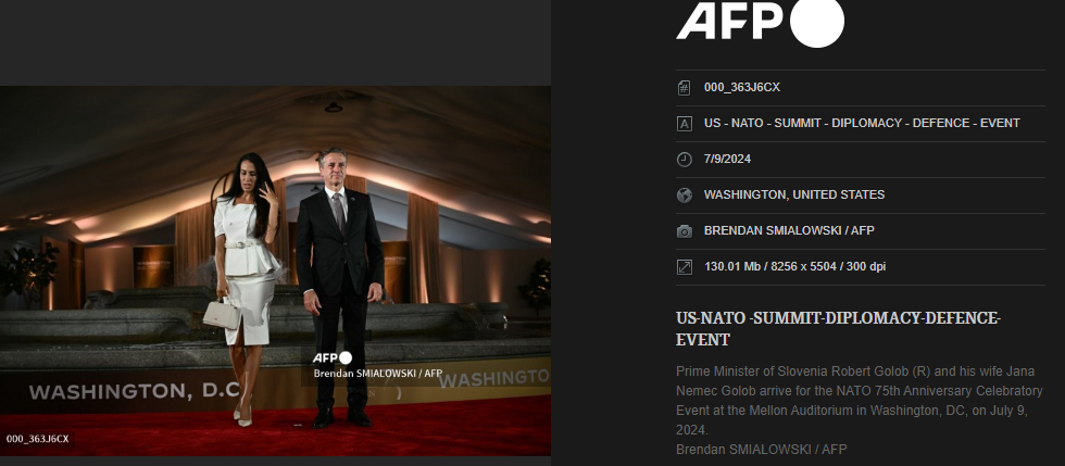 »Predsednik slovenske vlade Robert Golob in njegova soproga Jana Nemec Golob prispeta na slavnostni dogodek ob 75. obletnici Nata v Mellon Auditorium v ​​Washingtonu,« so zapisali pri francoski mednarodni tiskovni agenciji AFP.