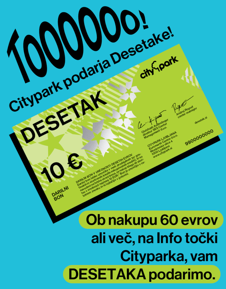 Do te sobote obiskovalce Cityparka čaka prav posebna akcija. Ob vsakem nakupu darilnih bonov DESETAK v vrednosti 60 evrov ali več vam enega DESETAKA podarijo. Akcija velja samo za fizične osebe, ki nakup opravijo na info točki v Cityparku.