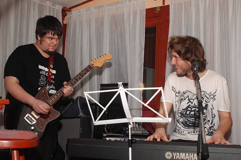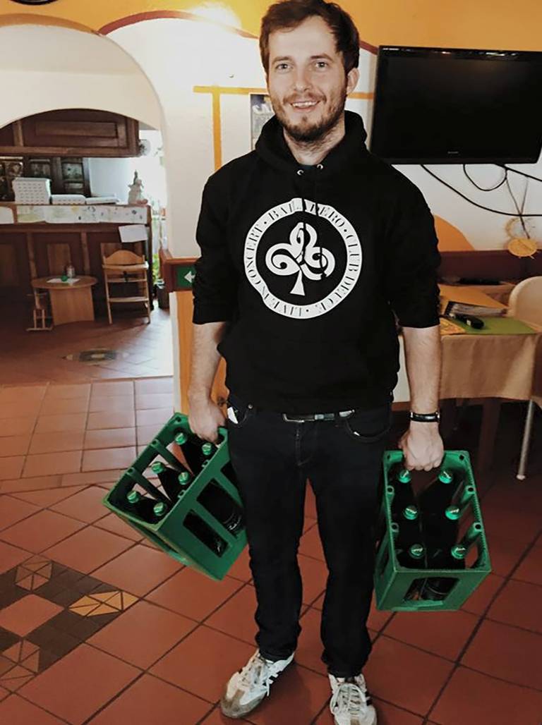 "Nedolgo zatem sem si pustil 'čupo' in postal Balladero, a še pred tem pa sem svoje prve songe s kolegi iz prejšnjih bendov (na sliki je zraven mene mojster kitare Sašo Benko - Bekko) preizkusil na Glasbeni Gourmet večeri v naši gostilni."