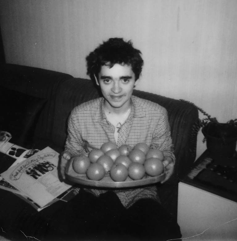 "Predpriprave pri sošolcu v Novi Gorici na večerni koncert Dead Kennedys v sosednji stari Gorici. Zakaj držim na pladnju pomaranče? Nimam pojma! (smeh) je bil pa koncert predober, čeprav je trajal le dobro uro. Moj prvi punk koncert so bili Ruts v Hali Tivoli, kjer sem pozneje gledal še The Ramones, ki so sicer moj najljubši bend, a sem bil na koncu precej razočaran. Delovali so naveličani en z drugim, ni bilo prave energije, zvok pa je bil katastrofalen. V osemdesetih sem videl še UK Subs, Sex Pistols in The Clash, dveh praktično najbolj razvpitih punk bendov pa nisem slišal v živo. Če bi moram izbirati med temi dvemi imeni, bi to bili brez debate The Clash."