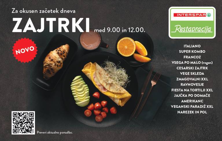 Z mislijo na želje obiskovalcev njihovih restavracij so v Sparu tako uvedli težko pričakovano novost – raznolike, sveže pripravljene zajtrke, ki so na meniju vsak dan od 9. do 12. ure v vseh osmih Restavracijah Interspar po Sloveniji.