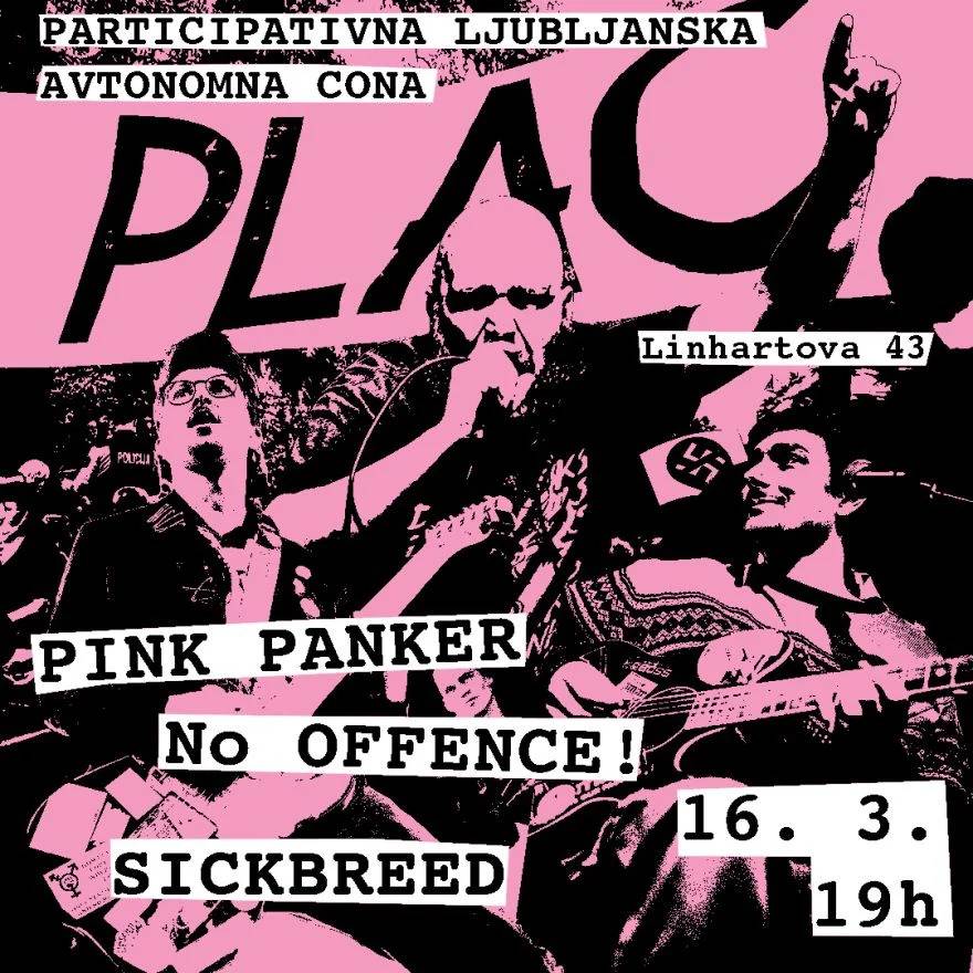 Od 19. ure v prostorih PLAC - Participativna Ljubljanska Avtonomna Cona potekal večer Pank Plac. Nastopile bodo punk skupine Pink Panker, No Offence! in SickBreed.