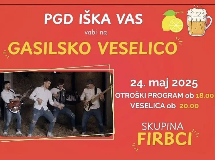 - Gasilska veselica s skupino Firbci na igrišču v Iški vasi ob 20. uri.