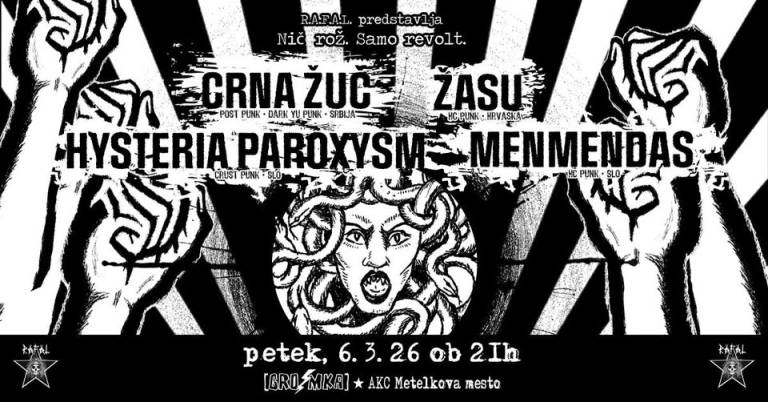V Klubu Gromka pa R.A.F.A.L. CRNA ŽUČ (Srbija) + ŽASU (Hr) + HYSTERIA PAROXYSM + MENMENDAS ob 20. uri, ob 23.55 pa Klubski večer Selektorka Svetlana Strojan.