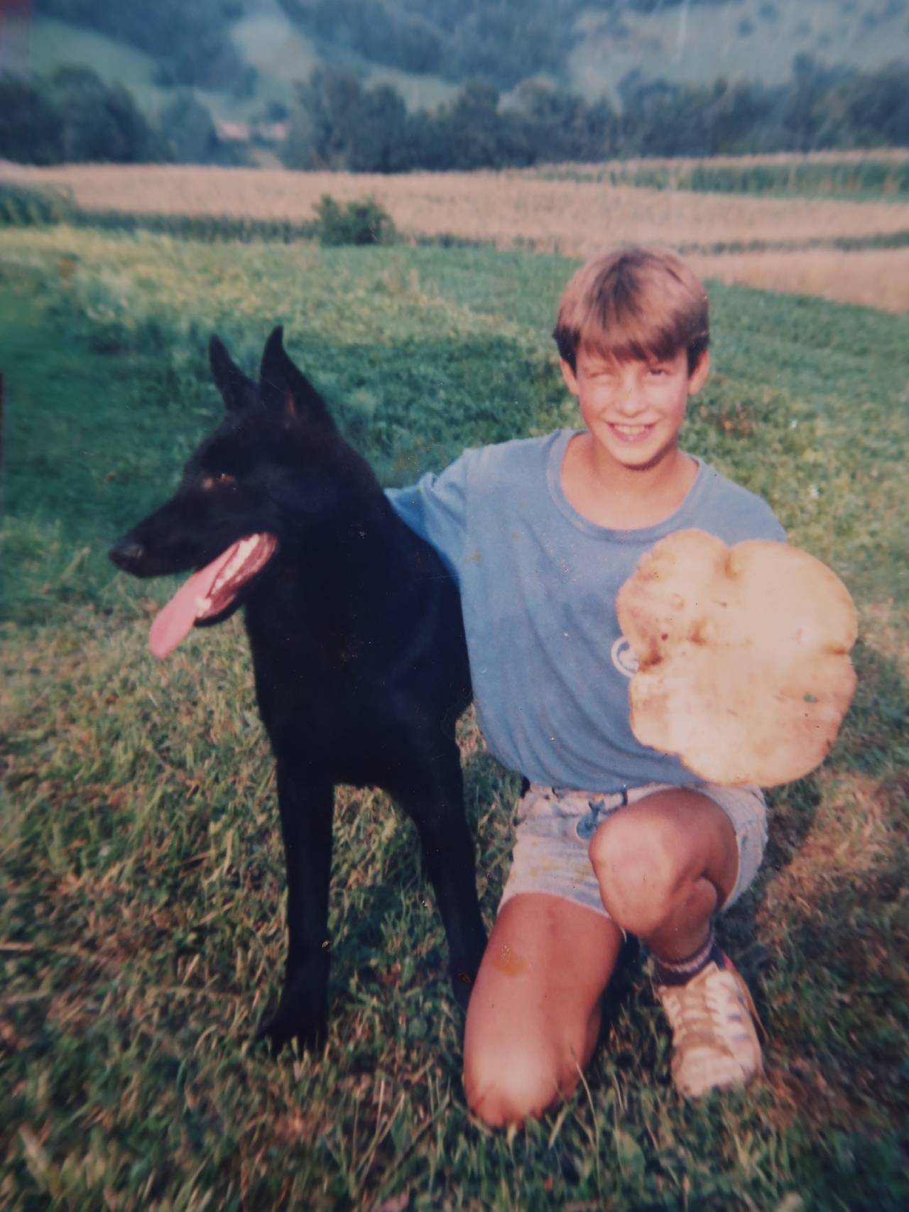 "Leta 1987 pri dvanajstih, na Dolenjskem z največjo gobo, ki sem jo našel v življenju! Z mano je naš pes Jon, s katerim sva bila dobra kompanjona. To so bila leta, ko me je prevzel breakdance, čeprav moja frizura tega ne kaže."