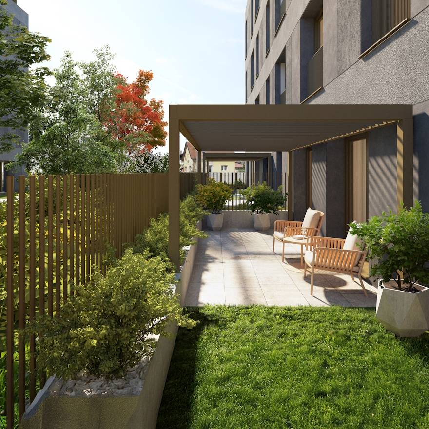 Tudi zunanja ureditev sledi misli na trajnost: zelene površine bodo dostopne le stanovalcem, opremljene s samodejnim namakalnim sistemom in zasajene z rastlinjem, izbranim za optimalno rabo prostora in vode.